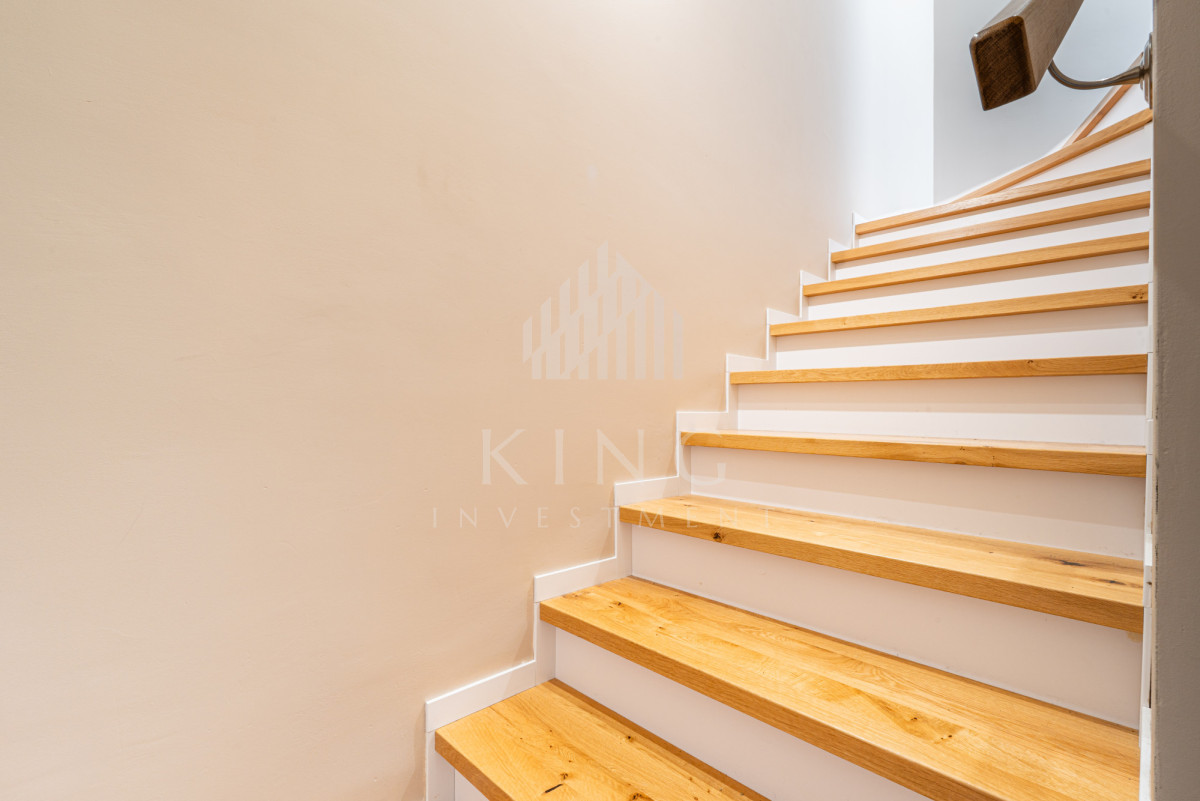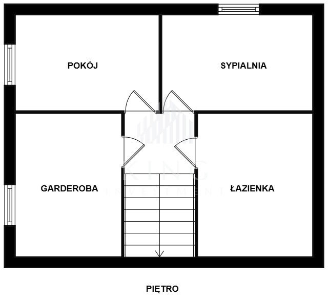 Piętro: dwie ustawne sypialnie, łazienka, funkcjonalna garderoba z możliwością adaptacji na dodatkową sypialnię lub gabinet do pracy. Korytarz na piętrze jest jasny dzięki oknu dachowemu, które zapewnia dużo naturalnego światła.