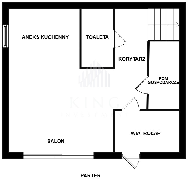 Parter: przestronny salon z aneksem kuchennym i wyjściem na taras i ogród, toaleta, pomieszczenie gospodarcze, wiatrołap.