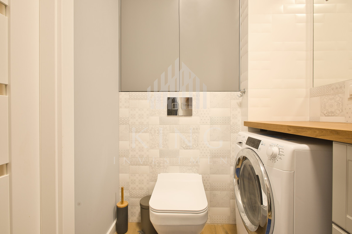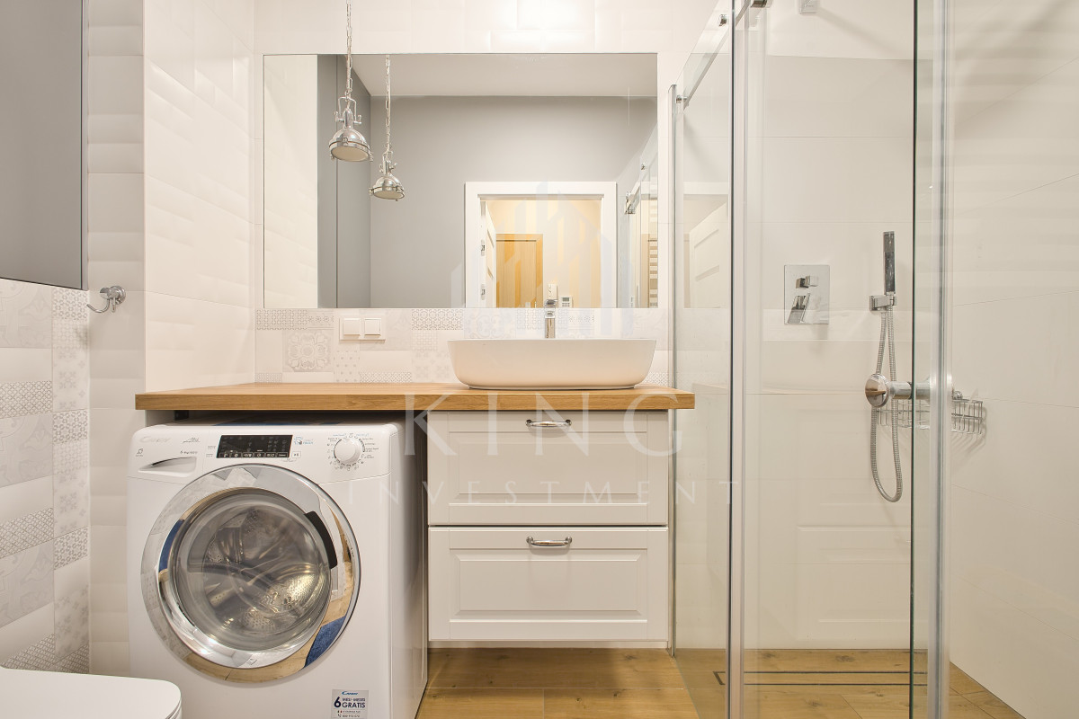 - Łazienka :Nowoczesna łazienka z pralką Candy, funkcjonalną zabudową meblową i wysokiej jakości armaturą.