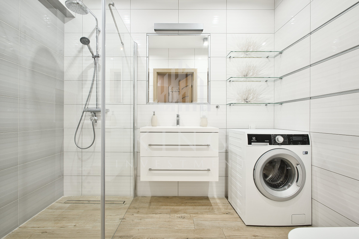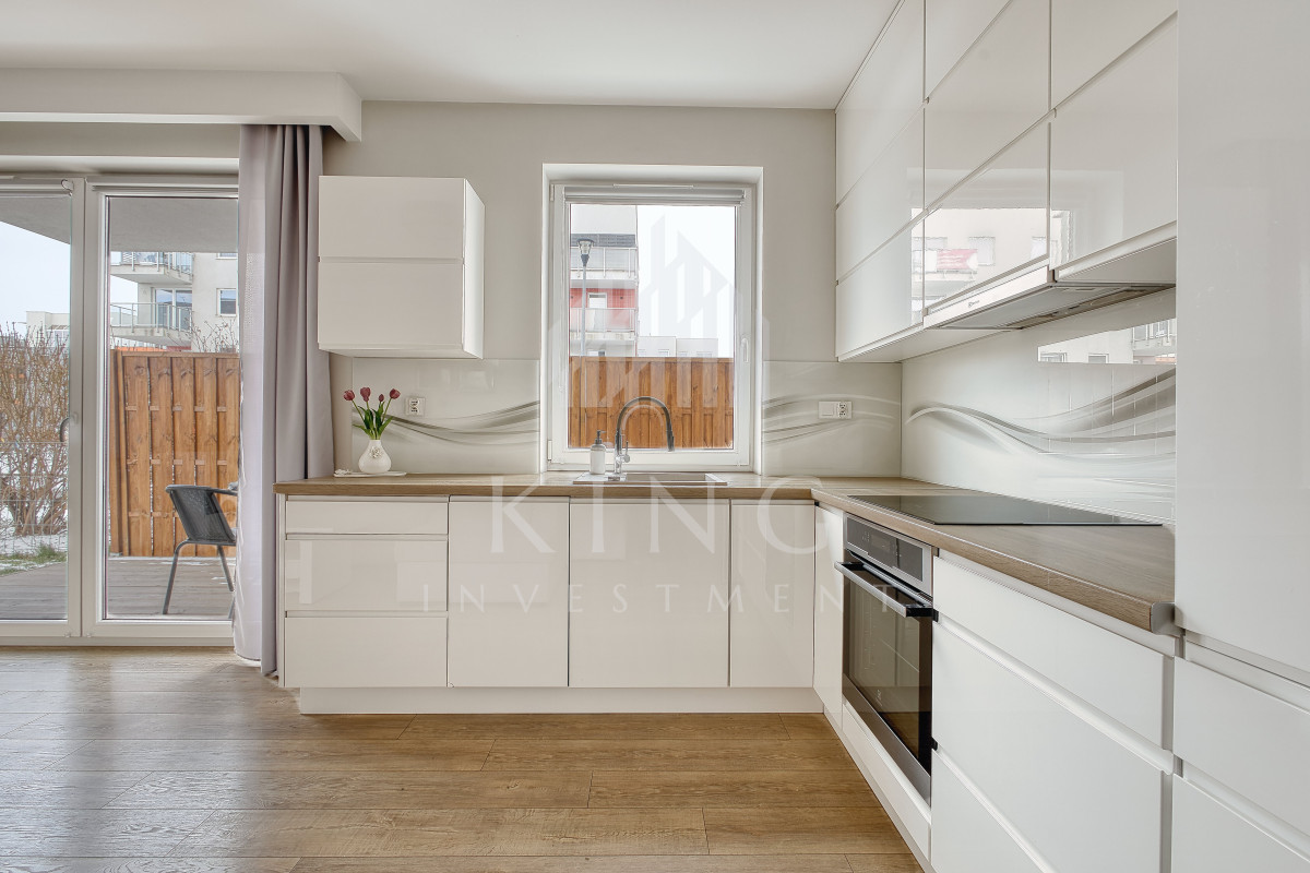 Lokal wyposażony między innymi w: zabudowę kuchenną z AGD, lodówkę, piekarnik, płytę indukcyjną, zmywarkę, pralkę.