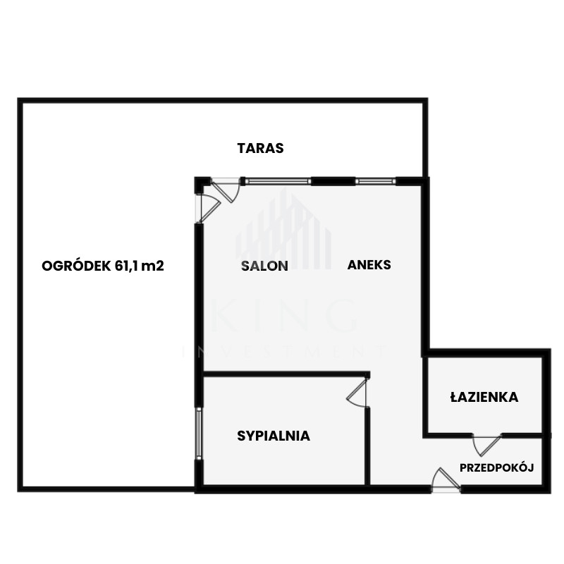 W skład wchodzi przestronny salon, aneks kuchenny, sypialna, łazienka i przedpokój.