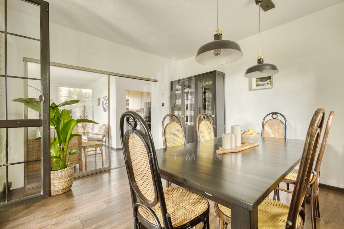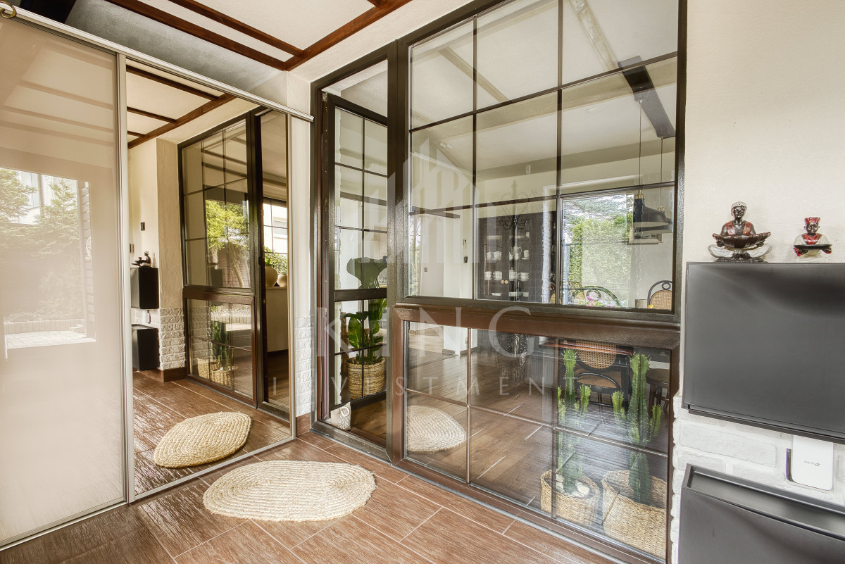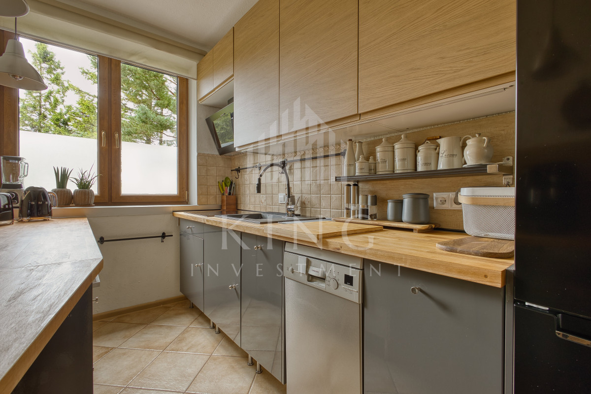 jadalni z przeszklonymi drzwiami, kuchni w zabudowie, w pełni wyposażonej w sprzęt AGD,