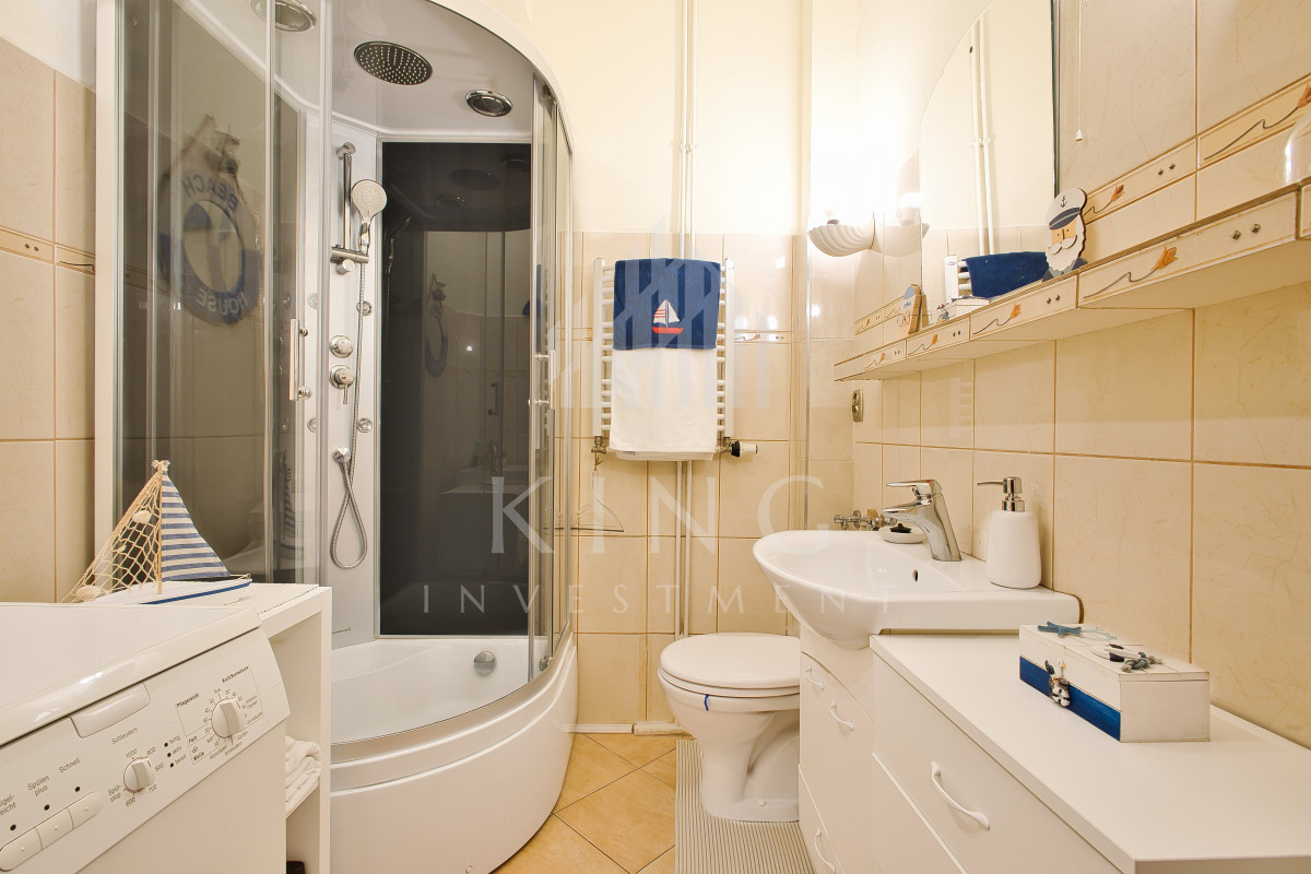 Łazienka jest w pełni wyposażona i utrzymana w bardzo dobrym stanie. Znajduje się tu nowoczesna kabina prysznicowa, pralka, umywalka z szafką oraz WC. Jasne płytki i praktyczne rozwiązania zapewniają wygodę codziennego użytkowania.