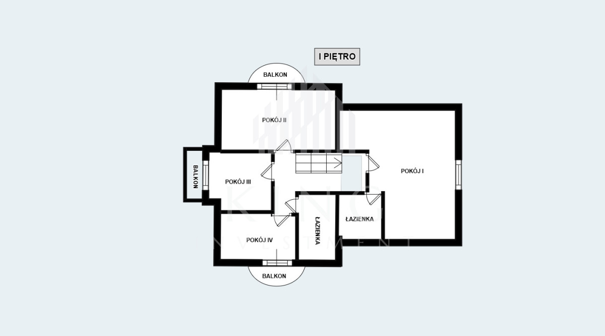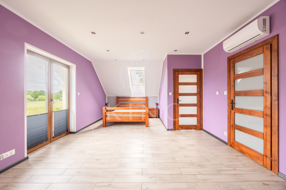 Piętro to cztery niezależne pokoje - główna sypialnia o pow. 27 m² z osobną łazienką (do wykończenia) i przestrzenią na garderobę, duża łazienka z miejscem na wannę (wanna w zestawie, również do wykończenia), drugi pokój o pow. 20 m² oraz dwa mniejsze po ok. 10 m² każdy. Wszystkie pokoje posiadają wyjścia na balkon - zastosowano dwuskrzydłowe drzwi balkonowe bez słupka.
