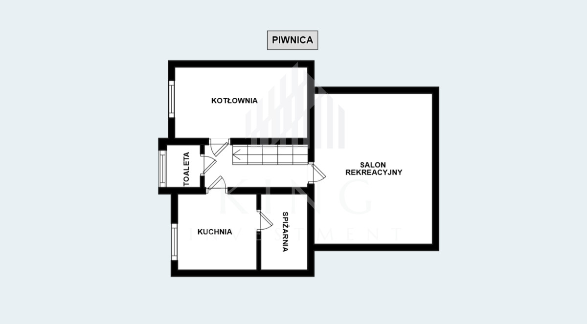 - Piwnica z kuchnią, toaletą, pom. gospodarczym i salonem rekreacyjnym (43 m²)