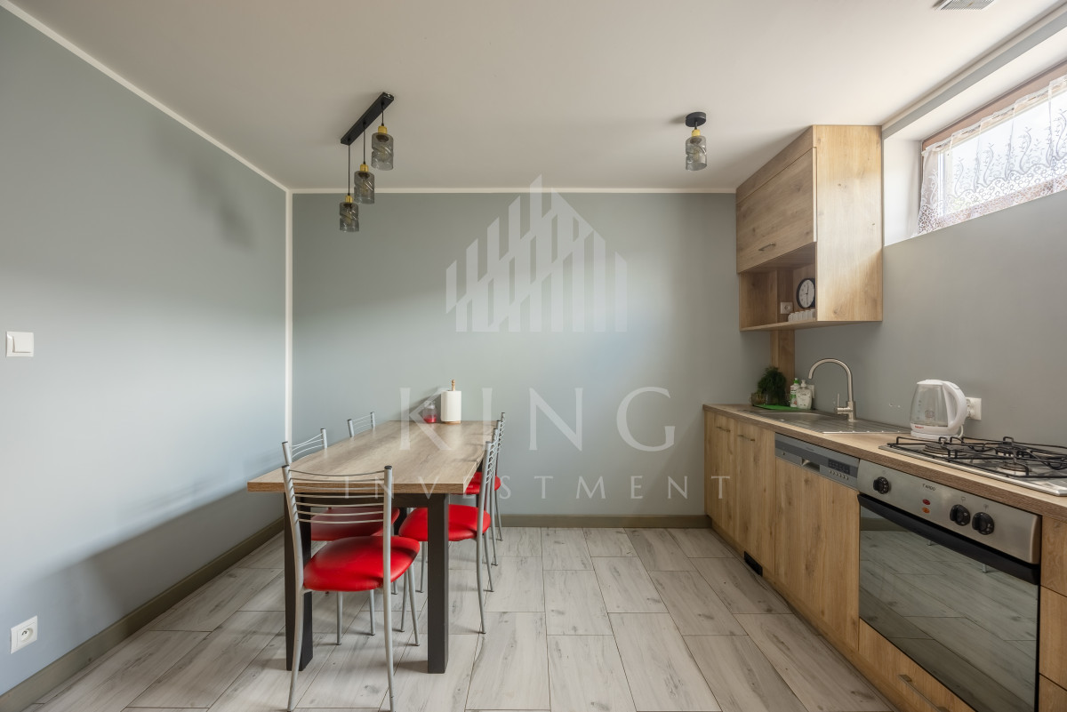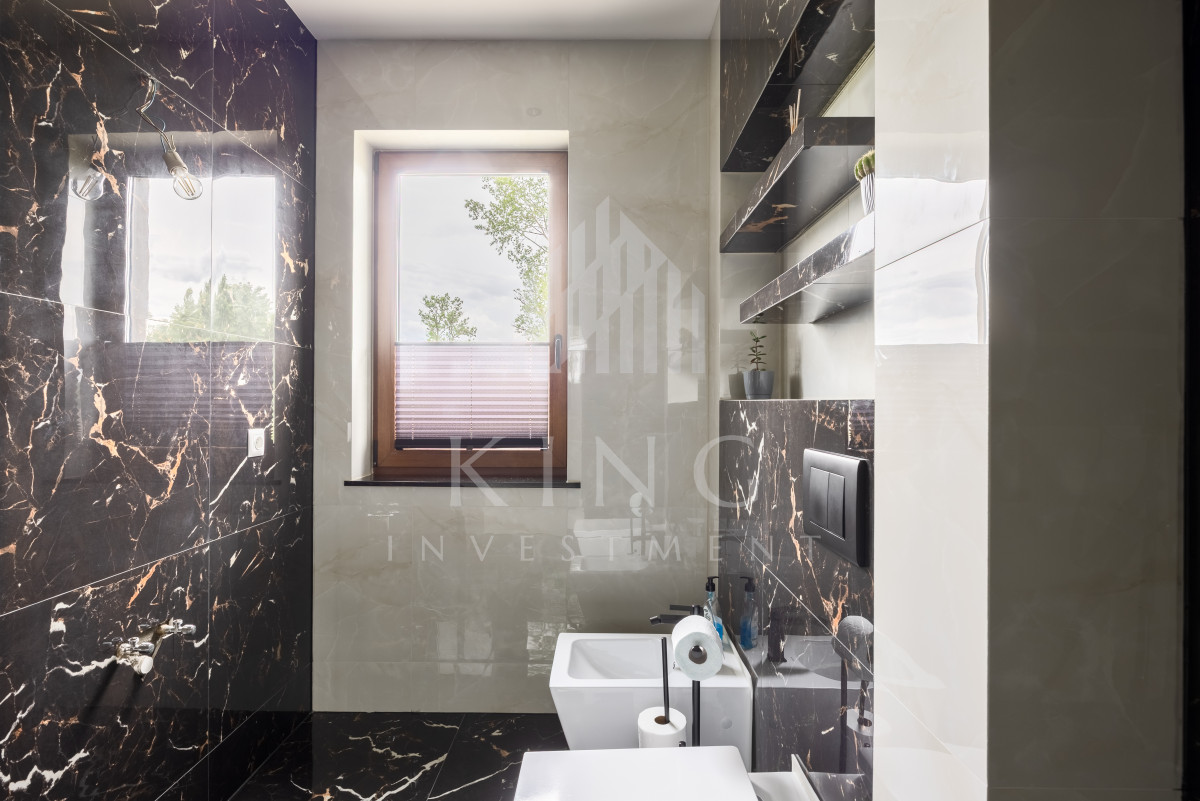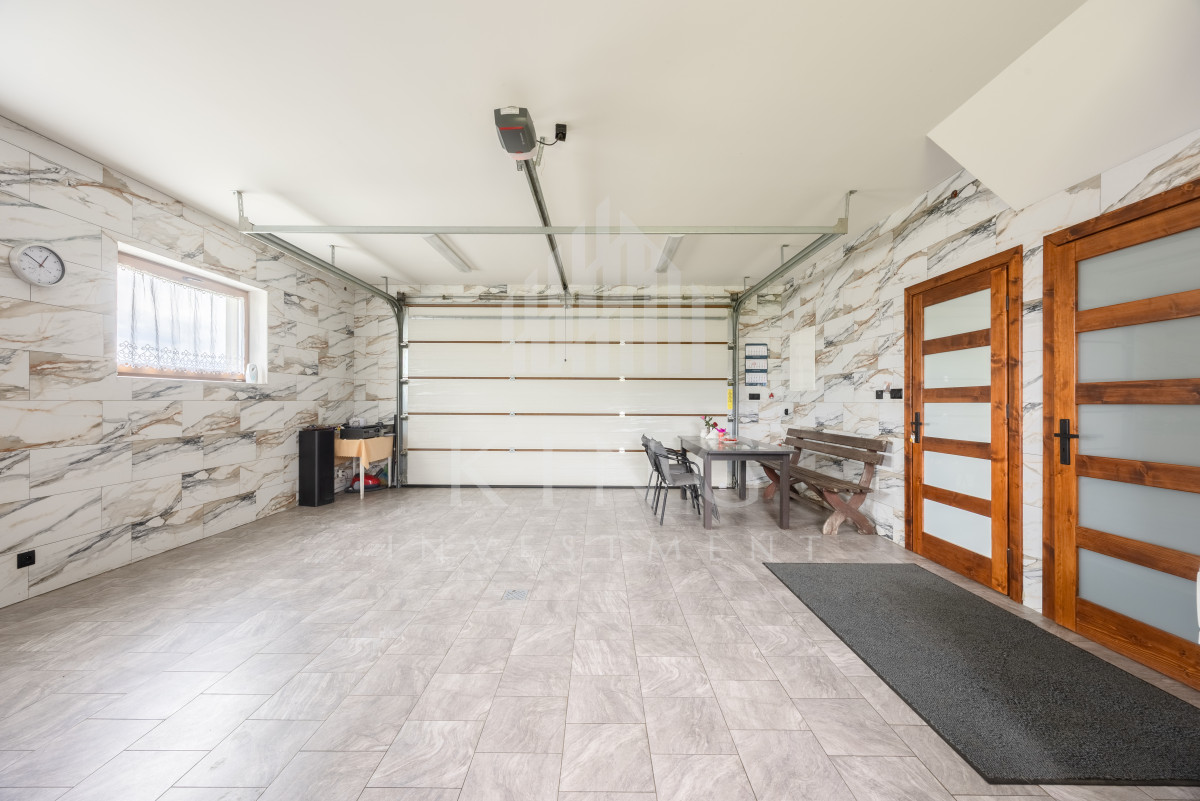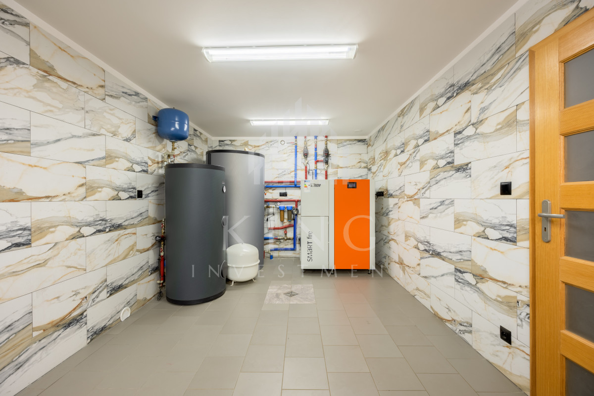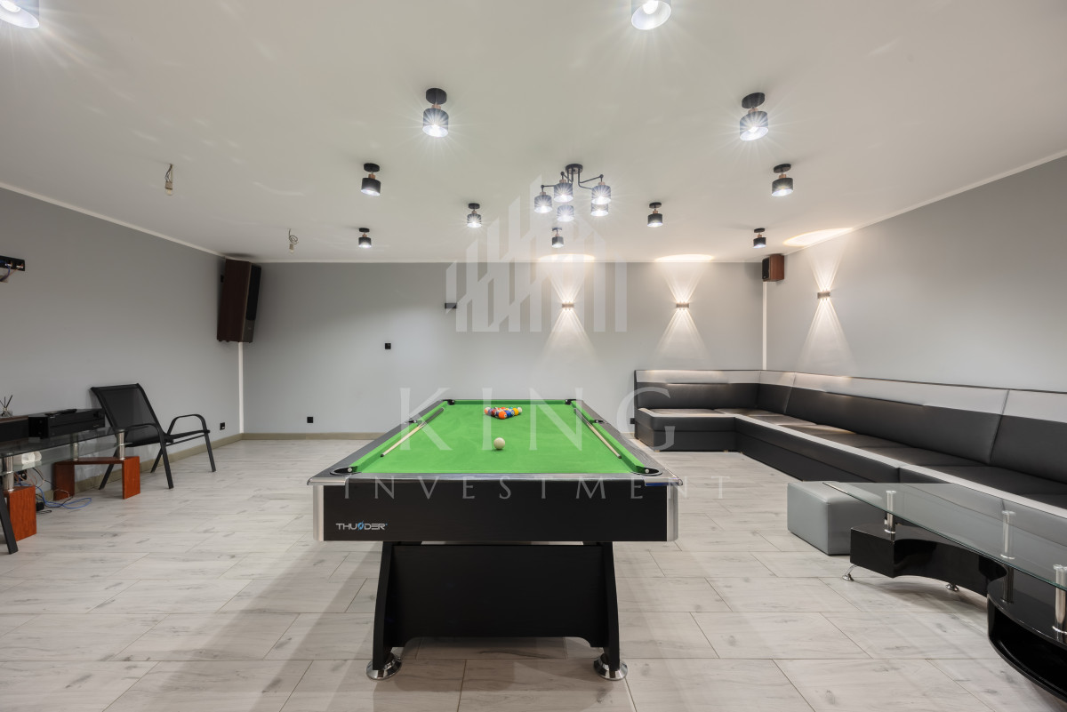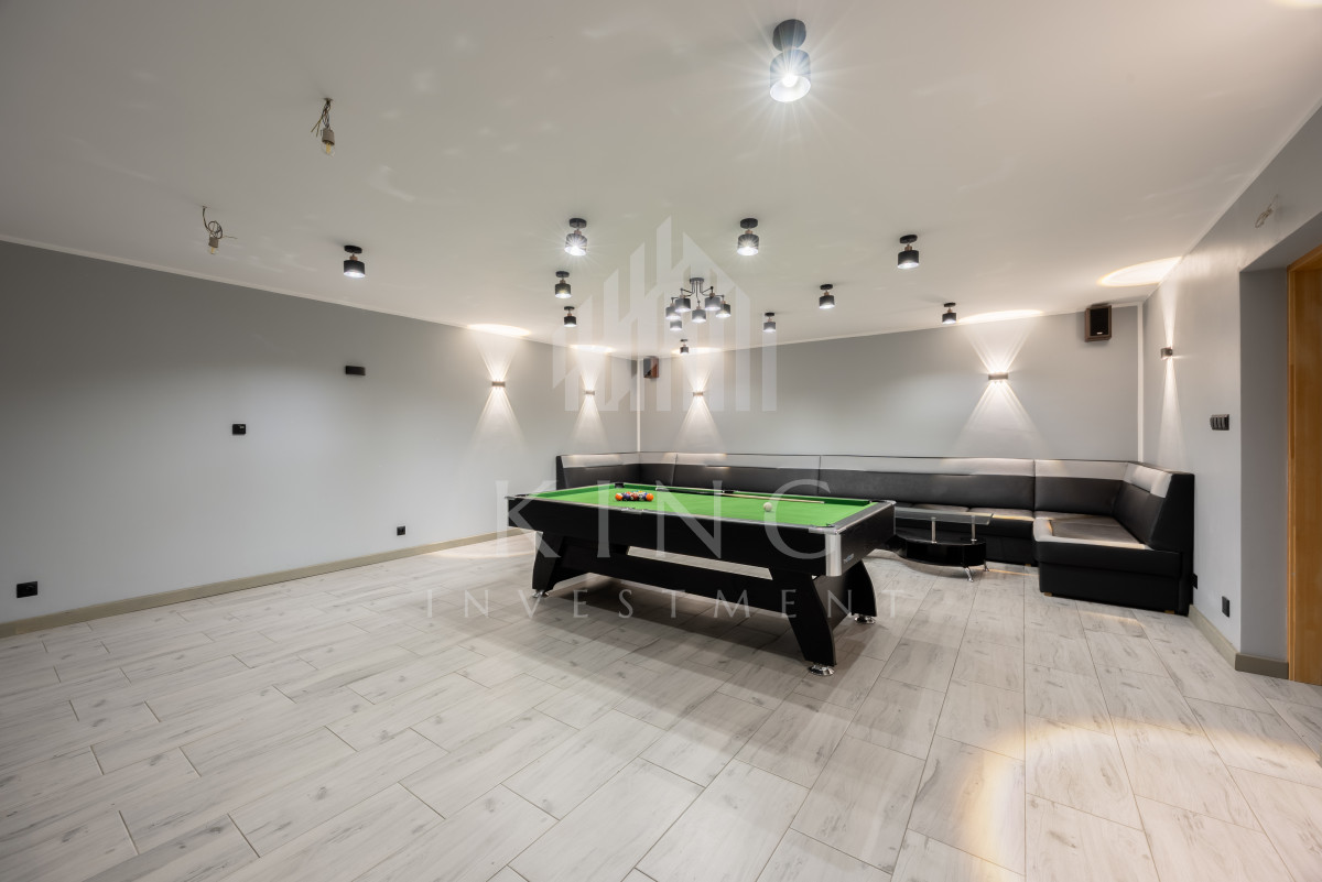 W części piwnicznej znajduje się pełna strefa relaksu: kuchnia ze spiżarnią, toaleta, pomieszczenie techniczne z kotłownią oraz duży salon rekreacyjny (43 m²) z miejscem na bilard, bar, lożę i system audio. Idealna przestrzeń do spędzania czasu z rodziną lub znajomymi.