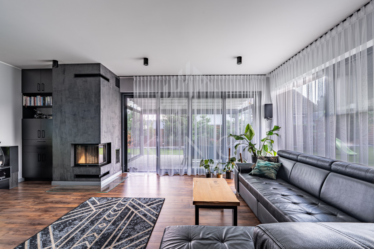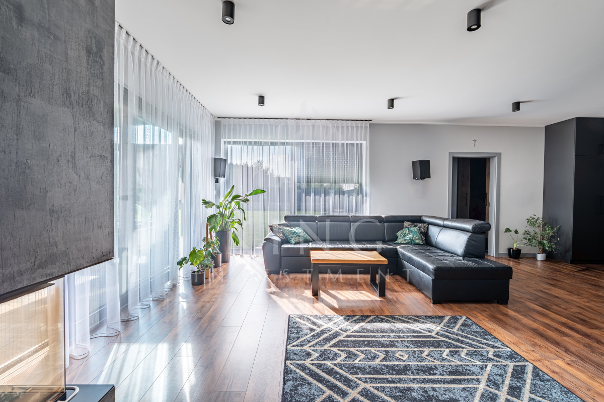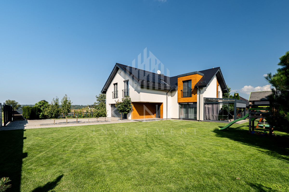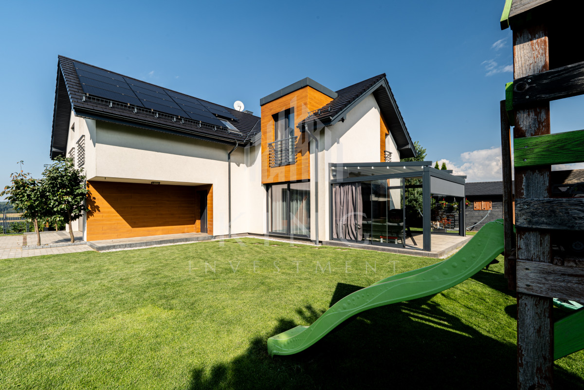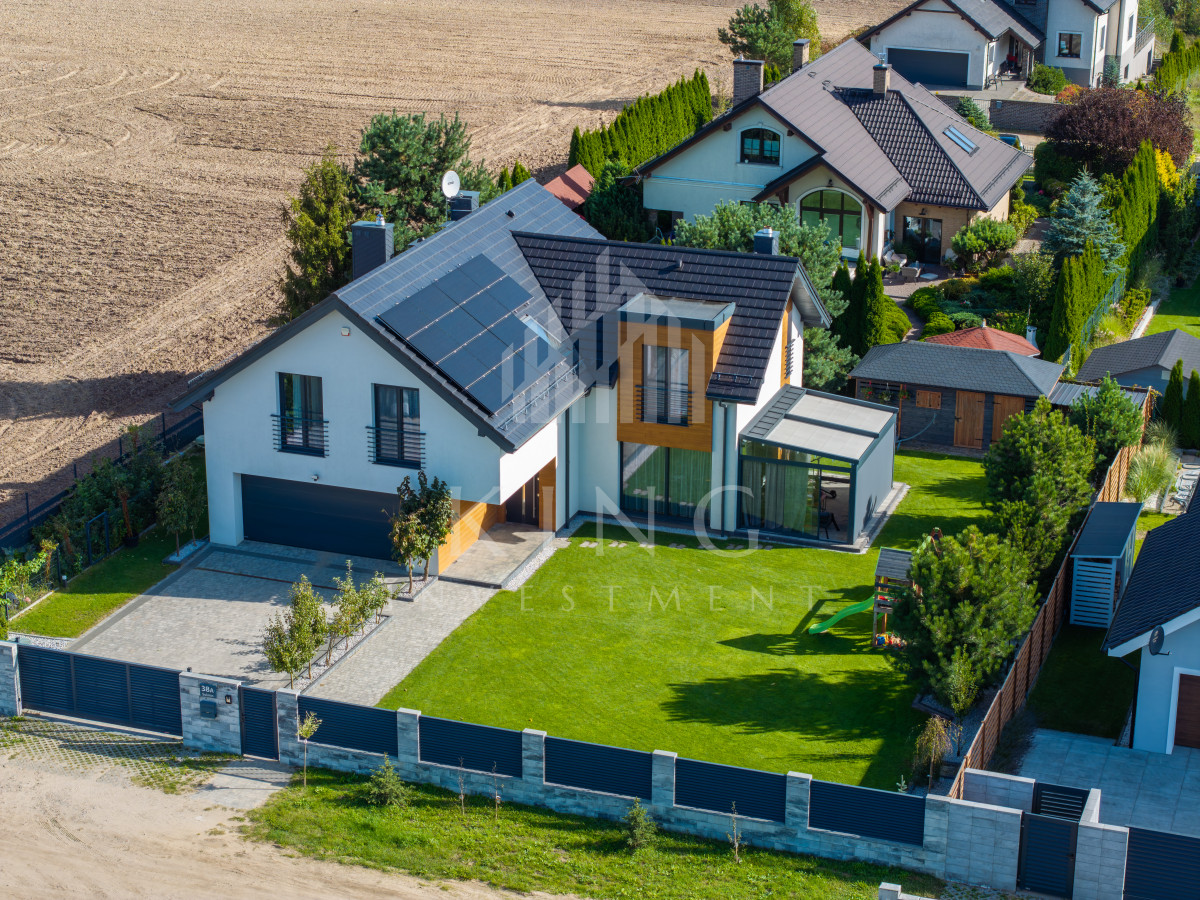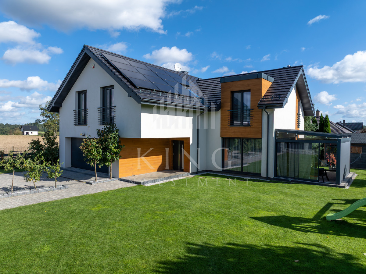 - Nowoczesne systemy: fotowoltaika 5,14 kW, rolety elektryczne, klimatyzacja, centralny odkurzacz, strefowy alarm, monitoring zewnętrzny, sterowanie z aplikacji