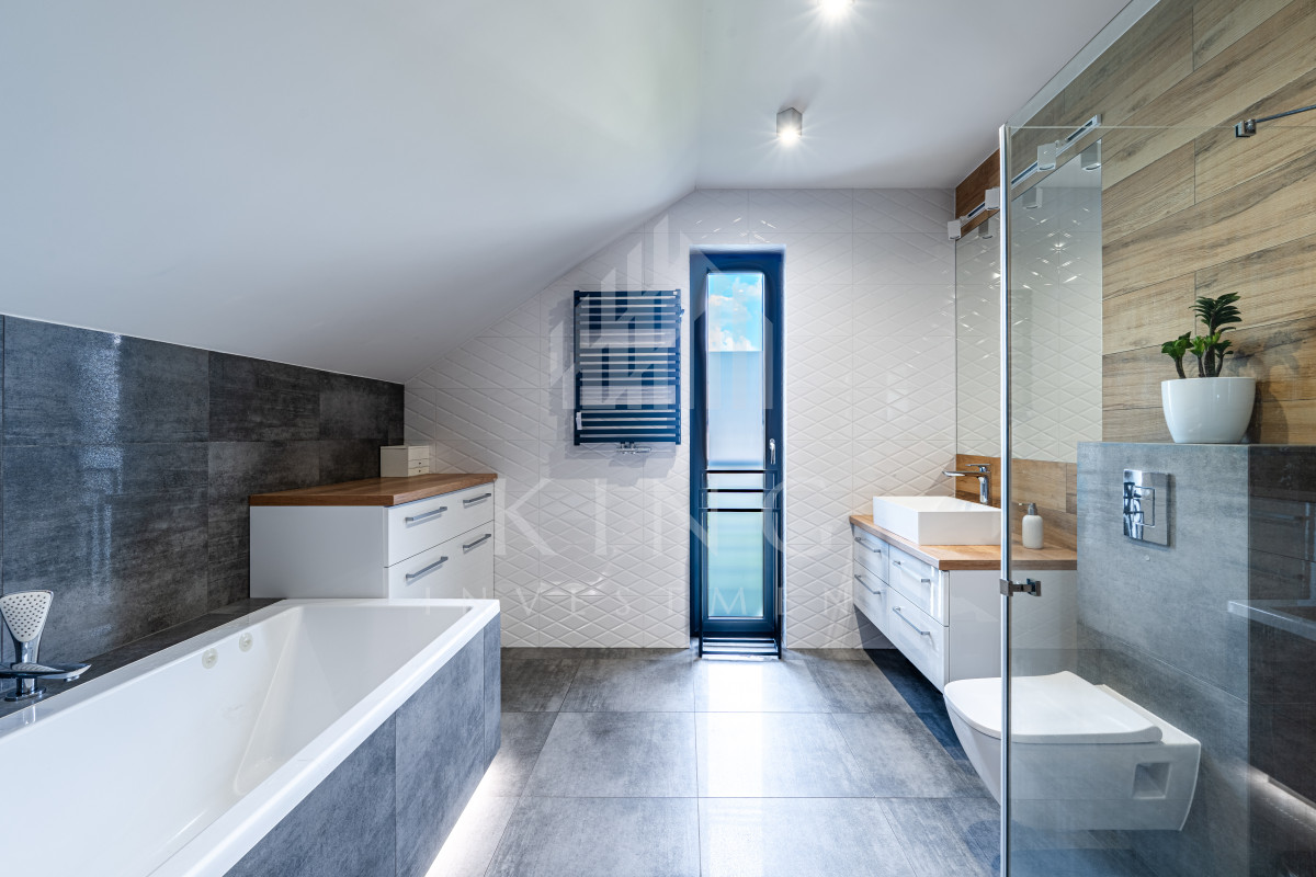Dom wyposażony jest w rolety elektryczne w całym budynku, stolarkę okienną trzyszybową Krispol, ogrzewanie podłogowe (również w garażu), strefowy alarm, monitoring oraz centralny odkurzacz.