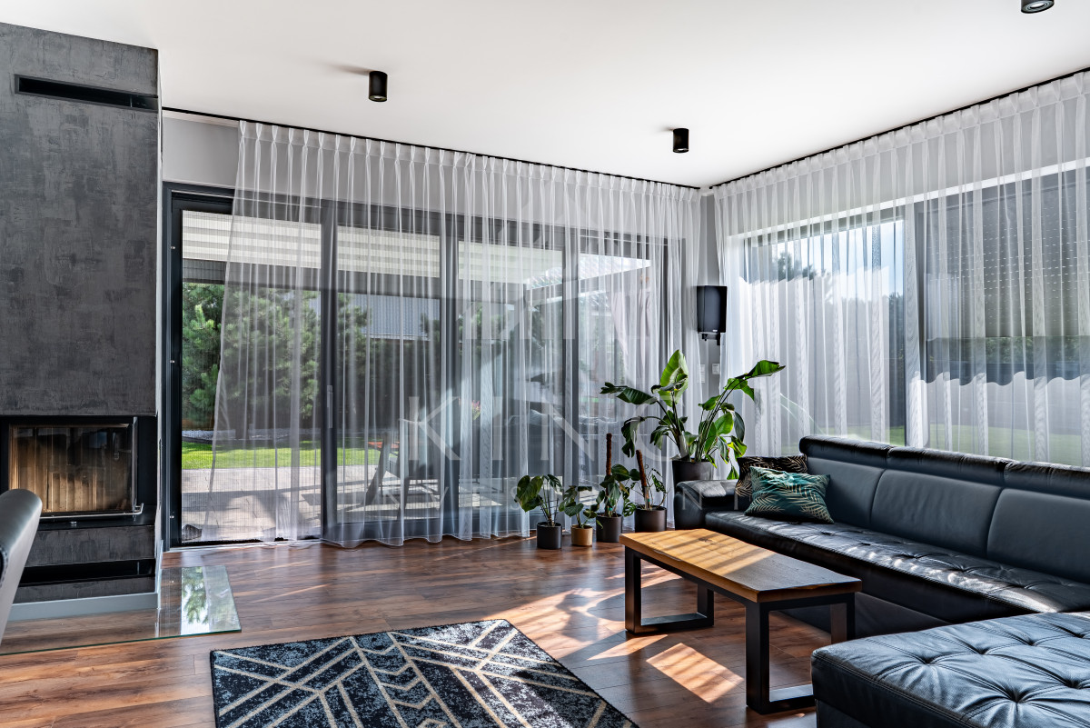 Salon z jadalnią (34,13 m²) - jasny, przestronny, z kominkiem i wyjściem na taras przez duże przesuwne okno HS