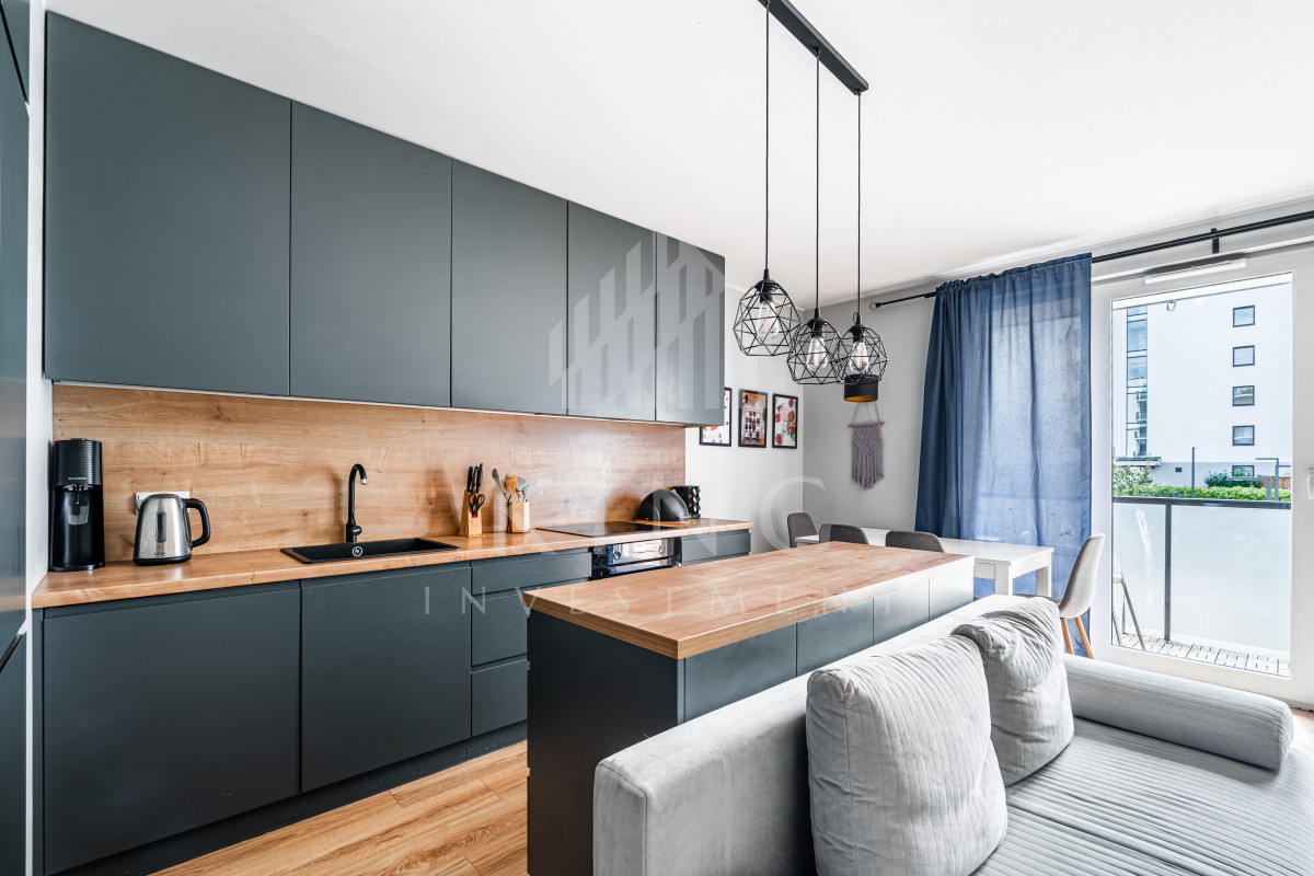 Przestronny salon z aneksem kuchennym wyposażonym w sprzęty (lodówka z zamrażarką, piekarnik, zmywarka, płyta indukcyjna, okap z filtrem węglowym) oraz wyspę
