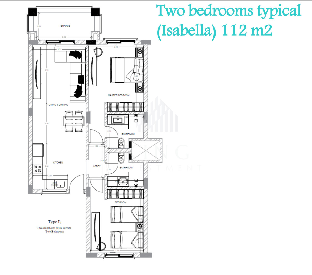 Przedstawiony Apartament "Isabella" (112 m²) oferuje dwie sypialnie i dwie łazienki. Po wejściu znajduje się lobby łączące wszystkie pomieszczenia. Część dzienna to salon z jadalnią i wyjściem na taras. Kuchnia jest oddzielna. Główna sypialnia ma prywatną łazienkę. Druga sypialnia znajduje się obok drugiej łazienki. Układ funkcjonalny, oddzielona strefa.